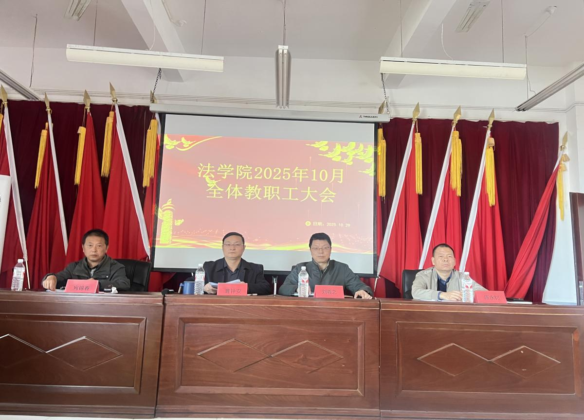 10月29日下午,法学院在香远楼624会议室召开全体教职工大会,以"建章立制,规范管理,团结合作,携手共进"为主题,对"十五五"发展规划、绩效考核、教学管理与学风建设、就业帮扶等重点工作再动员、再部署。大会由院党委书记刘羲之主持,院领导曹钟安、宛锦春、陈永钊及全体教职工参会。