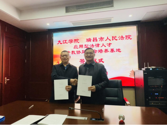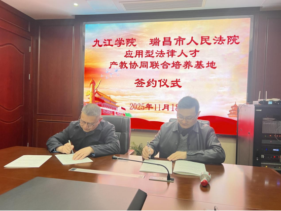 11月18日,九江学院法学院院长曹钟安、党委书记刘羲之一行前往瑞昌市人民法院,举行《九江学院应用型法律人才产教协同联合培养基地》合作协议签约仪式。瑞昌市人民法院党组书记、院长吴迎春主持仪式,双方就深化院校合作、共育法治英才展开深度交流。