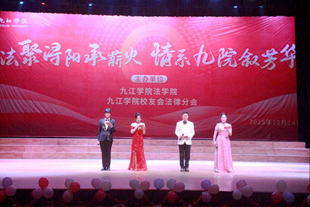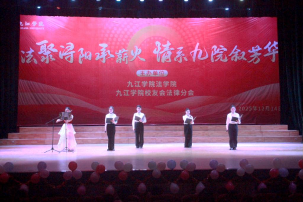 2025 年 12 月 14 日晚,九江学院法学院携手九江学院校友会法律分会在大礼堂隆重举办“法聚浔阳承薪火 情系九院叙芳华”主题晚会。党委委员、副校长查振华莅临观看,学生工作处副处长张堑、法学院党政领导、九江学院校友会法律分会代表及师生代表齐聚一堂,共赏这场兼具青春朝气与温情底蕴的文艺盛宴。