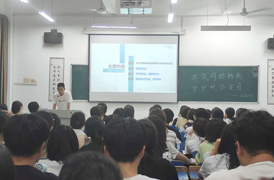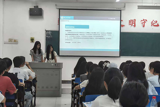 雷利桂简单讲述了今年新的“三金”资助政策。谢佳美详细阐述了家庭经济困难学生认定工作的流程及国家助学金的评审原则;蔡向禹详细介绍了国家奖学金的申请条件和校奖学金的评定方法,鼓励大家努力争取;童可欣详细说明了国家励志奖学金的评审标准。现场气氛热烈。